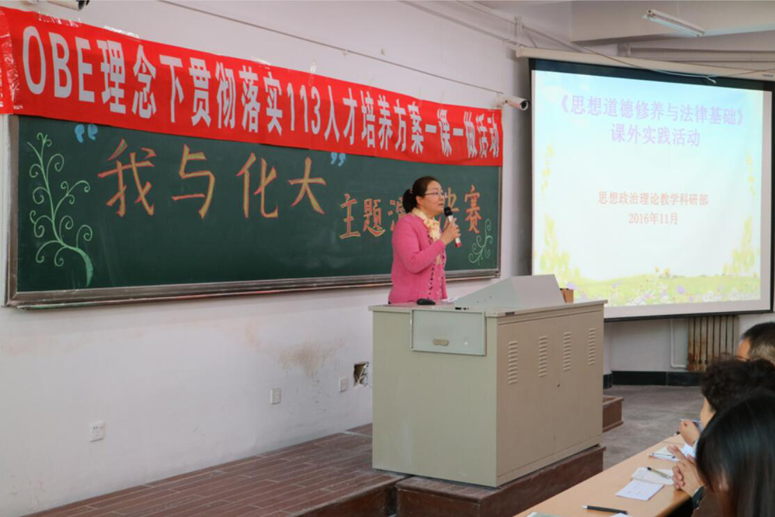 2016年11月9日下午1:30在应星楼104教室,由思政部品德与法律教研室策划举办了OBE理念下贯彻落实113人才培养方案“一课一做”活动,主题是“我与化大”演讲比赛,本次比赛于2016年9月19日开始启动,2016级本科生制药、环境、应化、金融、社工、材化和能源等七个特色专业15个班的同学参加了本次活动。