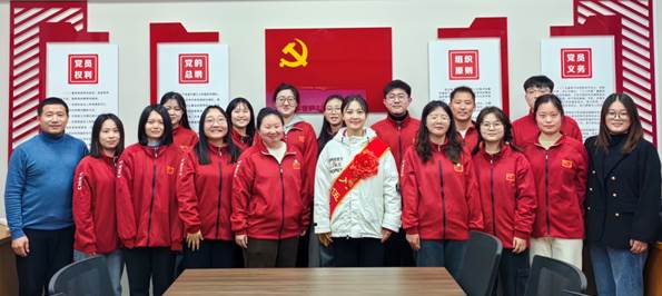 薛孚、郭苗苗为姜心同学披上绶带,戴上大红花,并赠送纪念品。