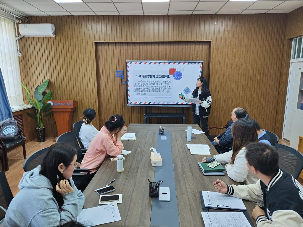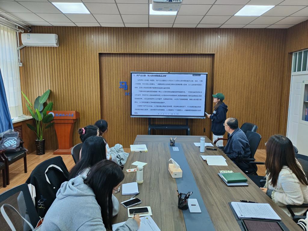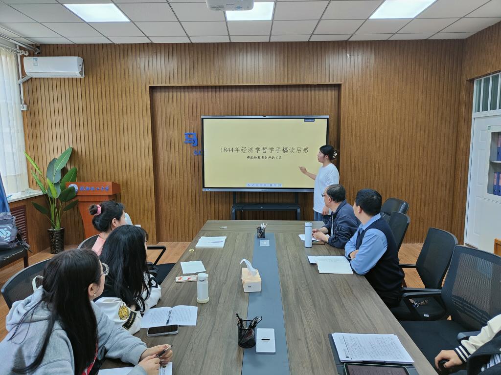 王丽云从劳动和私有财产的关系入手分享读书体会,她指出,当马克思开始开始探索私有财产和异化劳动相互关系时,已然逐渐撩开了私有财产的虚假面纱。张岩从历史背景入手,分析了马克思撰写《手稿》之时,德意志与其他国家的发展背景以及整个欧洲的大环境,有助于进一步深化对理论的认识。付珍从共产主义是“对人的本质的真正占有”、共产主义是自然主义和人道主义的完成、共产主义是“历史之谜”的解答三个方面分享了对《手稿》中共产主义思想的认识与理解。韩咏秋从整体视角分享了对《手稿》中异化劳动理论的认识,并尝试分析了当前学校生活中存在的“异化”现象。高婕分享了对异化劳动四重规定性的认识,即劳动者同劳动产品相异化、劳动者同劳动活动相异化、人同自己类本质的异化、劳动中人与人之间关系的异化。